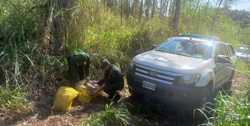 Este lunes por la tarde, dos hombres cargaban con pesados bultos mientras se desplazaban a pie sobre un camino en el monte, en cercanías de los Saltos del Tabay, en la localidad de Jardín América, con rumbo a la orilla del río Paraná, en el límite con Paraguay.