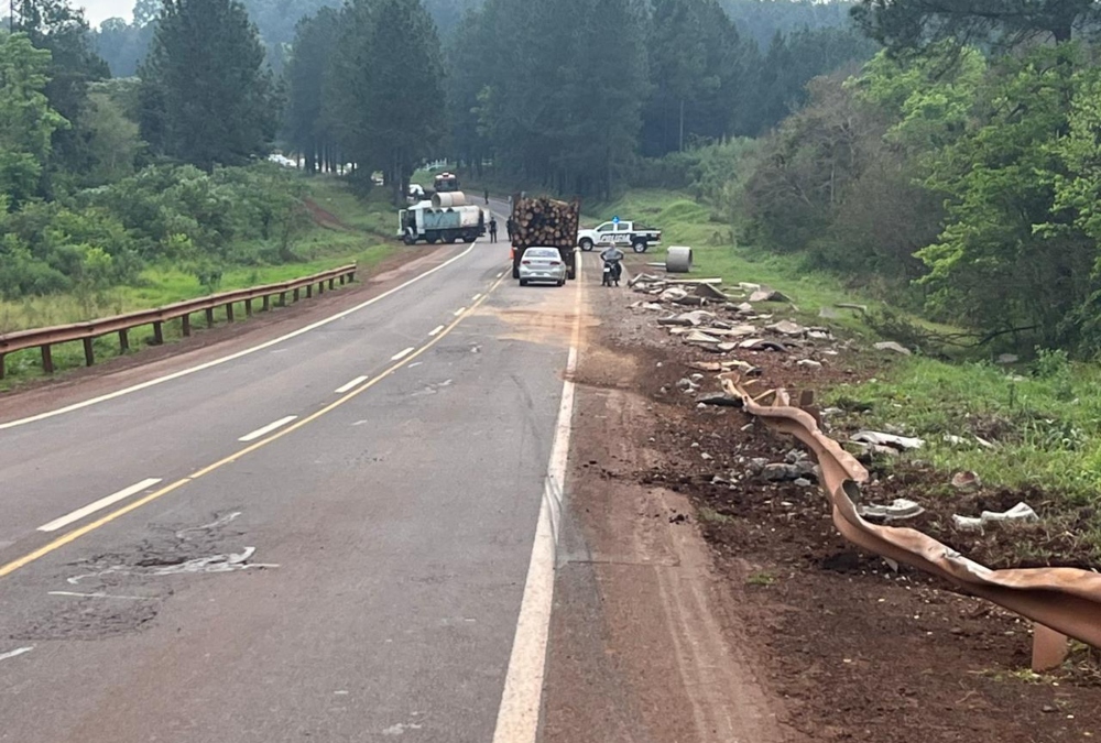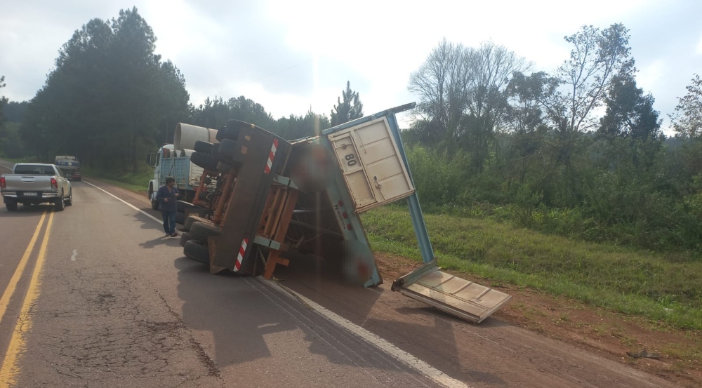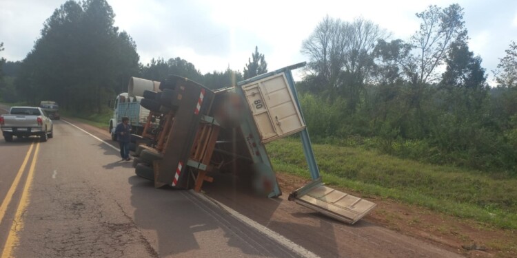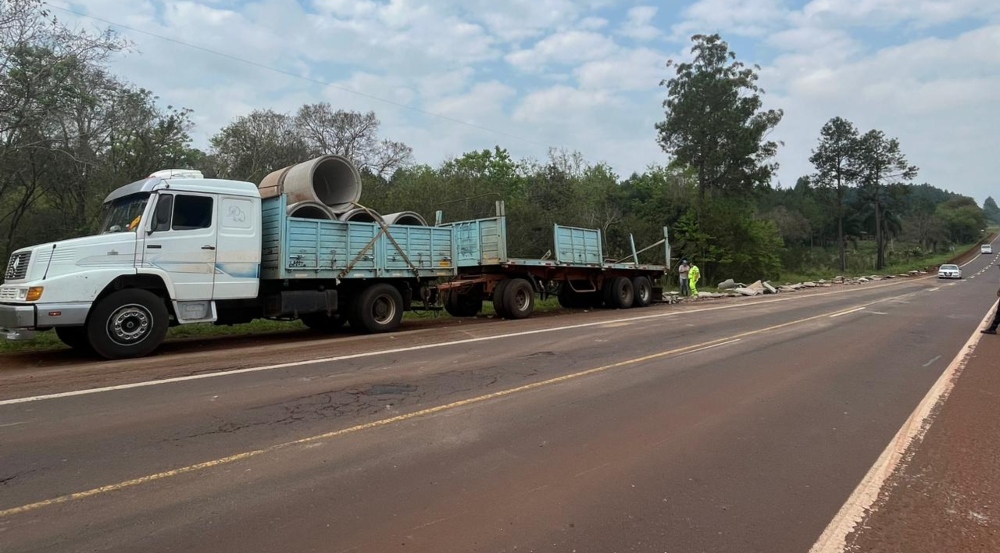 Por causas que se tratan de establecer el conductor de un camión Mercedes Benz que transportaba tubos de hormigón perdió el control del rodado y terminó volcando el acoplado.