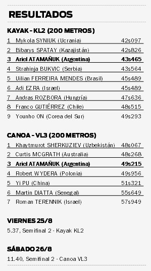 De esta manera, Atamañuk está en dos semifinales ya que el miércoles consiguió la clasificación en los 200 metros de la modalidad Kayak KL2, donde también quedó tercero, con un tiempo de 43s456.
