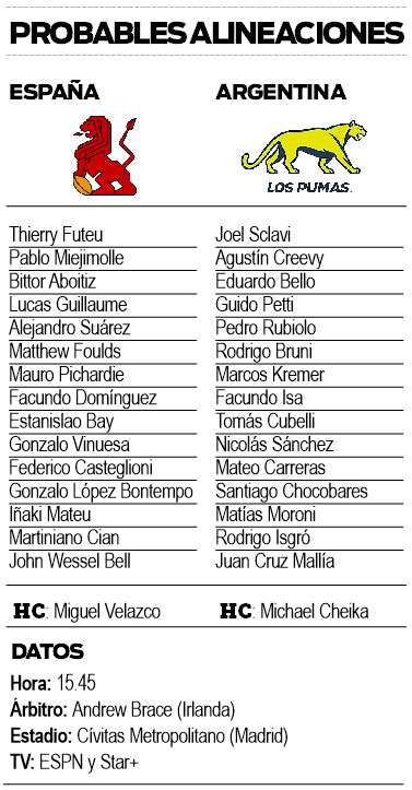 El seleccionado argentino de rugby, Los Pumas, se medirá este sábado frente a su par de España, en un partido amistoso, y contará en su formación inicial con varios regresos, entre ellos, la pareja de medios integrada por Tomás Cubelli y Nicolás Sánchez, y los suspendidos Marcos Kremer (tercera línea) y el fullback Juan Cruz Mallía.