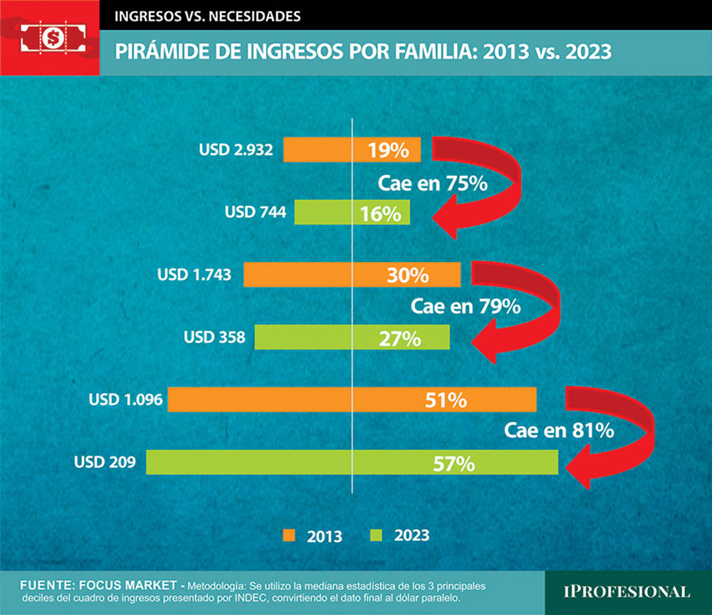 Esto significa que los ingresos reales en dólares cayeron en un 81% en los últimos 10 años. El decil más alto tenía ingresos por US$ 2.932 en 2013 y hoy US$ 744, es decir, 75% menos. A su vez, el decil siguiente tenía ingresos por US$ 1.743 en 2013 y hoy US$ 358, es decir, 81% menos.