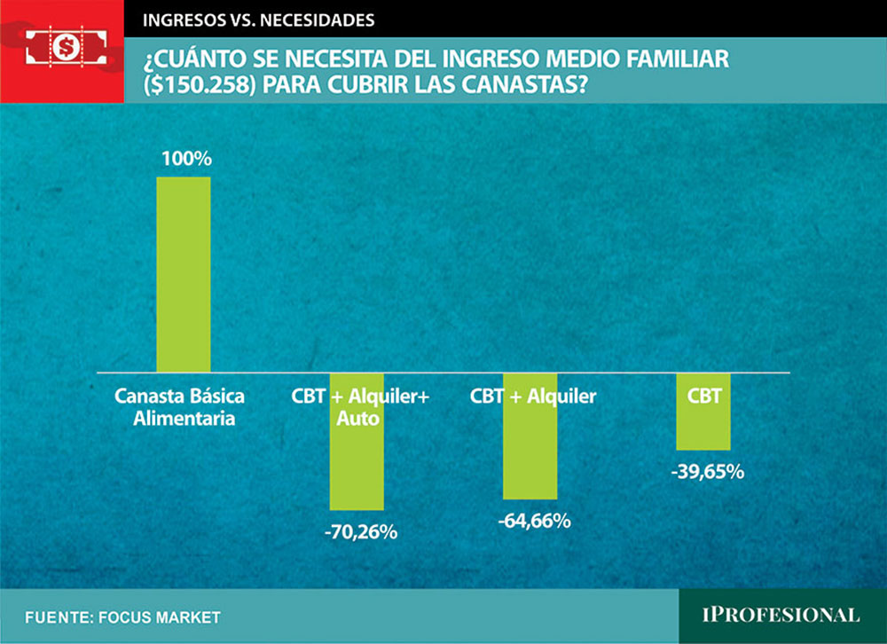 En el caso de una familia tipo con dos integrantes adultos y dos niños que tienen ingresos promedios por $150.218 de dos adultos (acá tomamos el ingreso del decil 7) cubre el 100% de la Canasta Básica Alimentaria ($111.642), pero no alcanza a cubrir una Canasta Básica Total ($248.962). Es decir, le falta un 39,65% para no continuar bajo la línea de pobreza, y además un 64,66% de ingresos para cubrir la totalidad de la CBT + Alquiler de $176.244 = $425.206 y un 70,26% para cubrir la CBT + Alquiler y el mantenimiento del auto (asumimos el valor de la Canasta Básica anterior sumado $80.000 en mantenimiento del auto = $505.206).