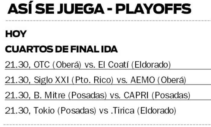 En el Estadio “Luis Augusto Derna” de la Capital del Monte, el ganador de la fase regular, Oberá Tenis Club, recibirá a El Coatí de Eldorado. Los dirigidos por Gastón Juliani son los máximos favoritos y buscarán adelantarse ante un elenco eldoradense, que añora meter el batacazo.