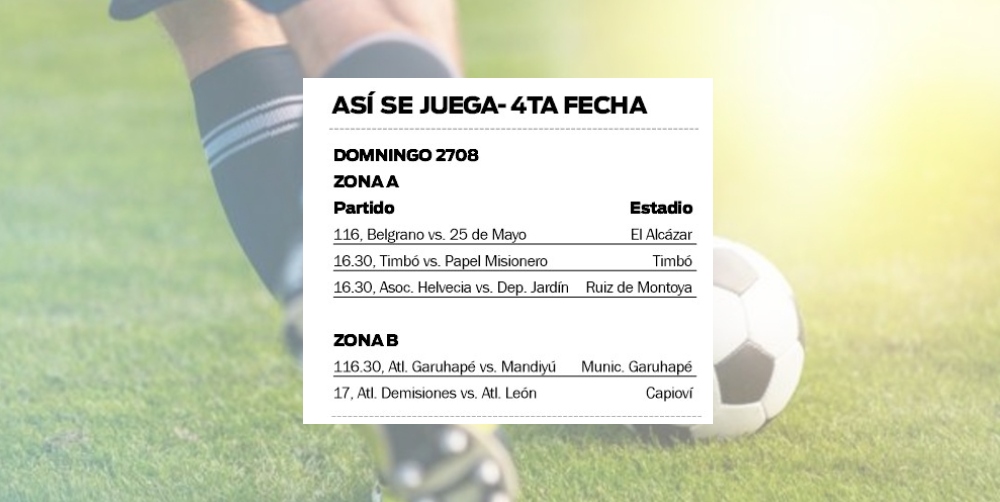 Por la zona A, el puntero Timbó recibirá a Papel Misionero. Mientras que Belgrano de El Alcázar enfrentará a 25 de Mayo. Helvecia se las verá con Deportivo Jardín.
