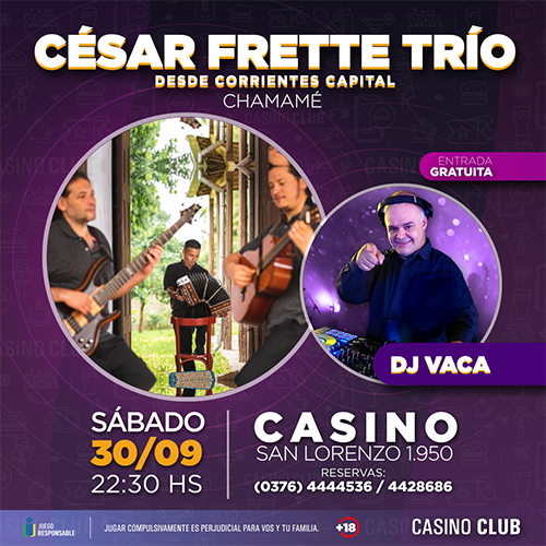 Así como ya es costumbre, el Casino Club traerá durante todo el mes de septiembre una variada cartelera de shows en vivo para disfrutar en sus tres locaciones, los días jueves en sala Garupá, ubicada en Ruta 12. Km 8,5; los viernes en sala Quaranta, ubicada en la avenida homónima al 6045; y cada sábado en Casino Central, de San Lorenzo 1950; siempre a partir de las 22.30.