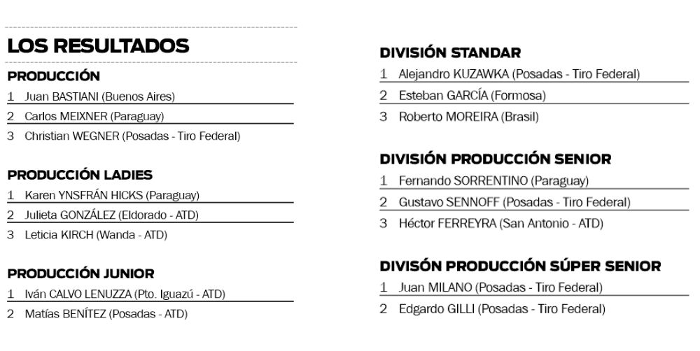 El torneo se disputó bajo la modalidad de diez etapas y 200 disparos. Y en ese contexto, el vencedor en la División Producción fue el bonaerense Juan Bastiani, campeón del Torneo Siete Naciones en Bolivia y bicampeón nacional, quien relegó al segundo puesto a Meixner. Para destacar fue el rendimiento de Christian Wegner, oriundo de Iguazú, quien se subió al podio.