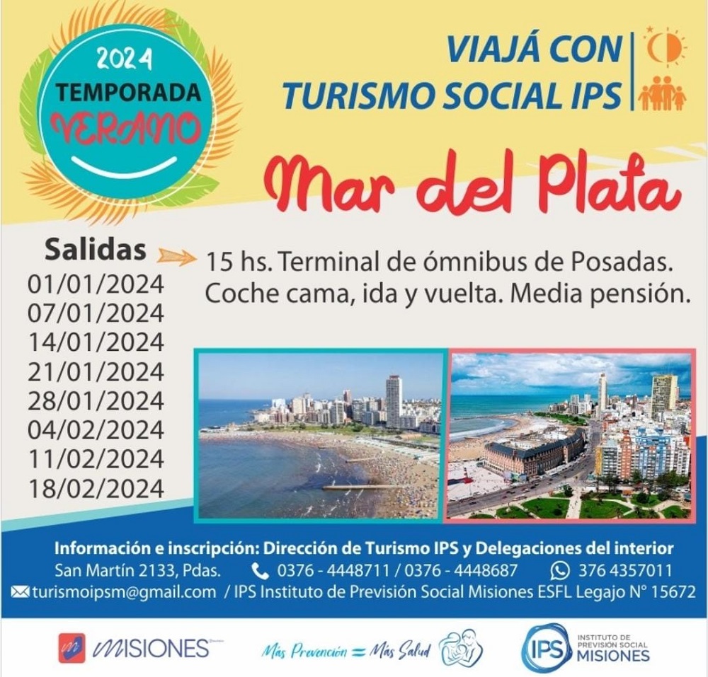 Para inscribirse u obtener más información hay que dirigirse a la Dirección de Turismo del IPS (calle San Martín 2.133 de Posadas) o a las delegaciones del interior. También pueden comunicarse los interesados a los teléfonos 0376-4448711 / 0376-4448687, o al correo electrónico [email protected]