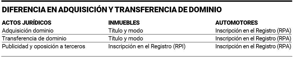 Con relación a los automotores, hasta que se dicta el Decreto Ley 6.582/58, la adquisición y la transmisión de dominio sobre ellos también se efectuaba mediante su entrega al adquirente, junto con el título, que bien podía ser un contrato de compraventa privado entre las partes. A partir de esta legislación, que conforma el Régimen Jurídico del Automotor, se produce un CAMBIO: la INSCRIPCIÓN REGISTRAL es el elemento CONSTITUTIVO del DERECHO DE PROPIEDAD, debido a lo cual, a diferencia del sistema de publicidad de los inmuebles, la inscripción en el Registro es un REQUISITO ESENCIAL PARA LA ADQUISICIÓN DEL DOMINIO.