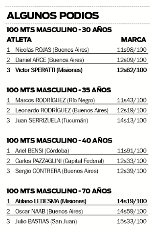 En ese contexto, fueron varios los atletas misioneros que lograron ayer hacer podio, tales los casos del bronce obtenido por Víctor Speratti, en 100 metros 30 años; o la medalla de oro que ganó Atiliano Ledesma en esa misma disciplina, en la categoría 70 años.