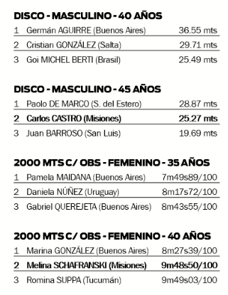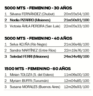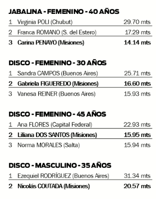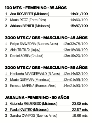 En cuanto a las chicas, no se quedaron atrás. En los 100 metros femeninos 35 años, la vencedora fue la posadeña Ana Rocabert, mientras que Adriana Beniti conquistó el bronce; al tiempo que en lanzamiento de jabalina 30 años el triunfo fue de Gabriela Figueredo, con una marca de 23,08 metros, escoltada por Paola Kalitko, con un registro de 22,57.