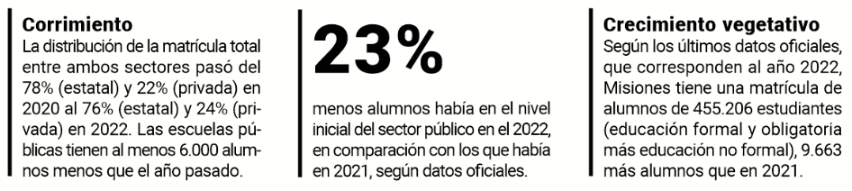 De hecho, entre 2021 y 2022 al menos 6.000 alumnos que estaban en la gestión estatal pasaron a la privada. Por esta razón, la distribución de la matrícula total entre ambos sectores pasó del 78% (estatal) y 22% (privada) en 2020 al 76% (estatal) y 24% (privada) en 2022.