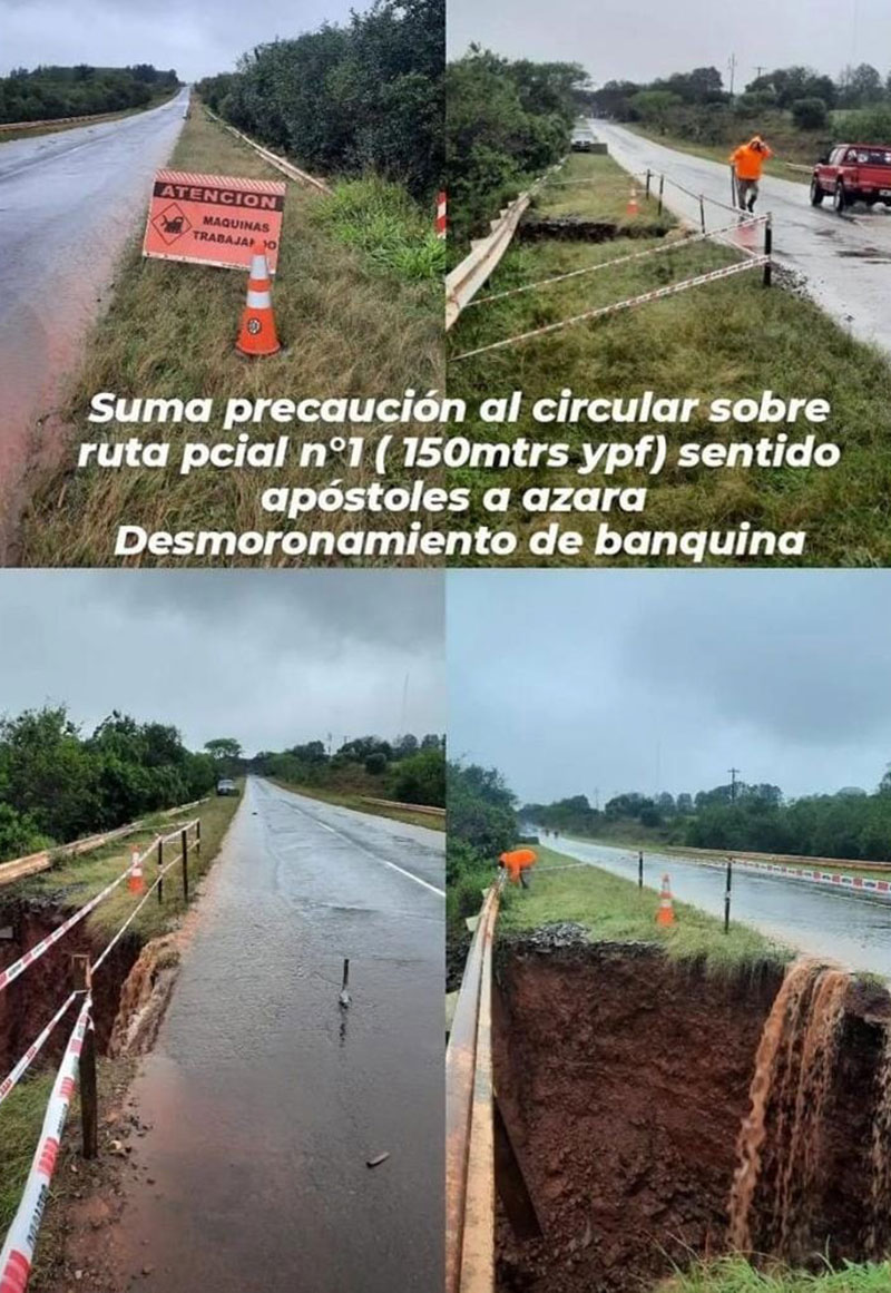 Ahora, sobre la ruta provincial 1, a unos 150 metros de una estación de servicio YPF, se desmoronó gran parte de la banquina (sentido Apóstoles – Azara), por lo que las autoridades solicitaron suma precaución a los conductores que transiten dicha arteria.