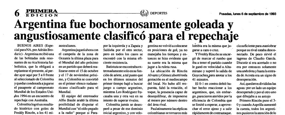El 5 de septiembre de 1993 Argentina recibía una de las bofetadas más resonantes de su rica historia futbolística, al perder por 5 a 0 como local frente al seleccionado de Colombia y quedar condenada a jugarse el pasaporte al Campeonato Mundial de los Estados Unidos 1994 en un repechaje con Australia.