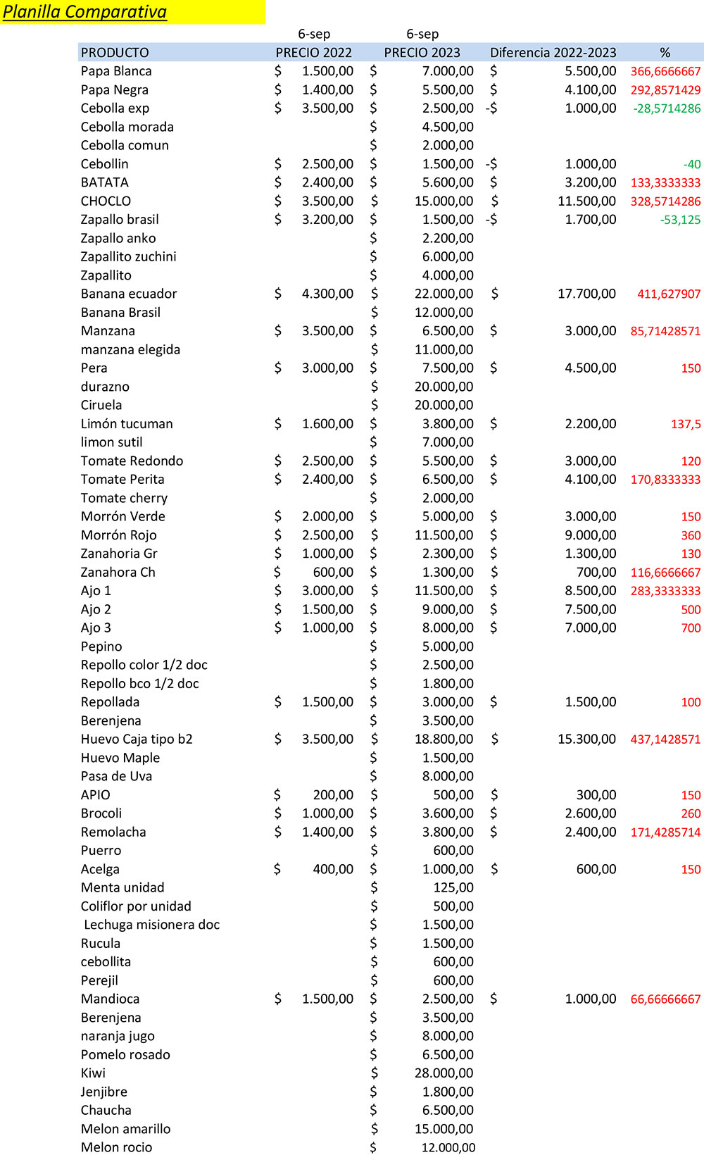 Como ejemplos más contundentes aparecen la papa blanca y la banana Ecuador, cuyos incrementos se situaron entre 366% y 411%, respectivamente. A su vez, en los negocios de barrio la situación repercute con efectos muy negativos en la economía diaria de las familias.