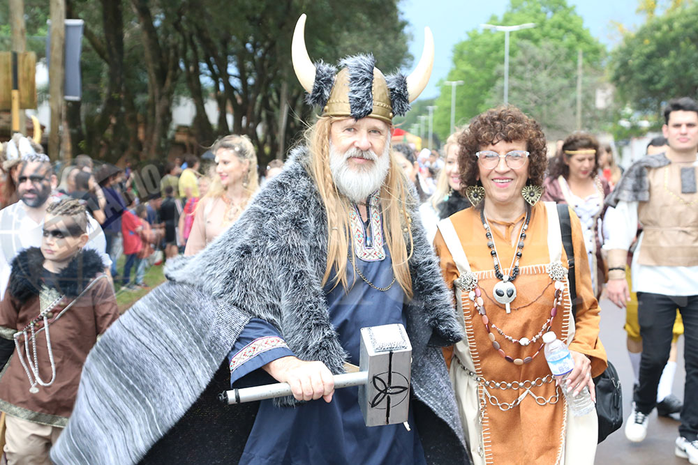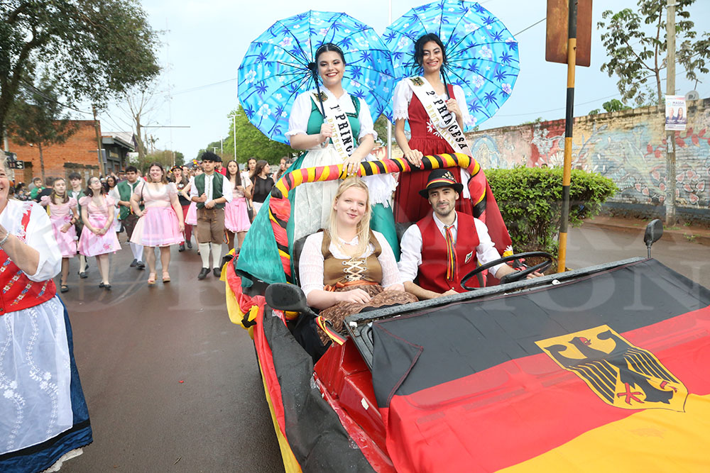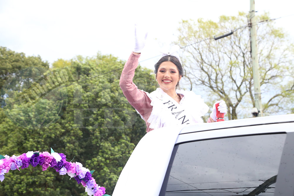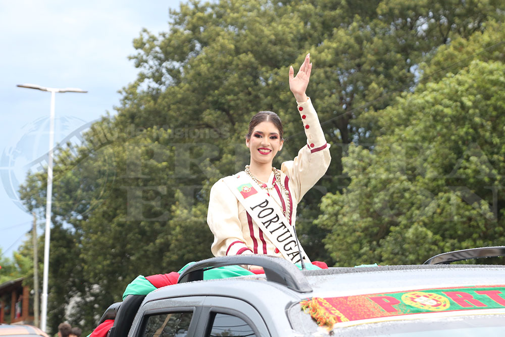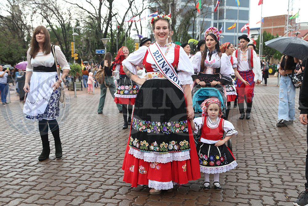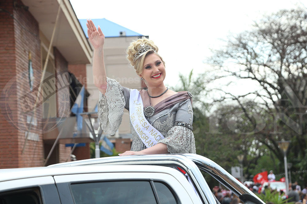 Enseguida hizo su entrada la Reina Nacional del Inmigrante, Loren Michel Weber de la colectividad Suiza. Así también, le siguieron la Primera Princesa Ana Paula Sowinski y la segunda princesa Catherine Bys. También dijeron presente los Reyes Mayores, quienes portaron orgullosos la bandera de la Fiesta del Inmigrante.