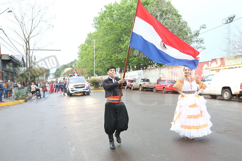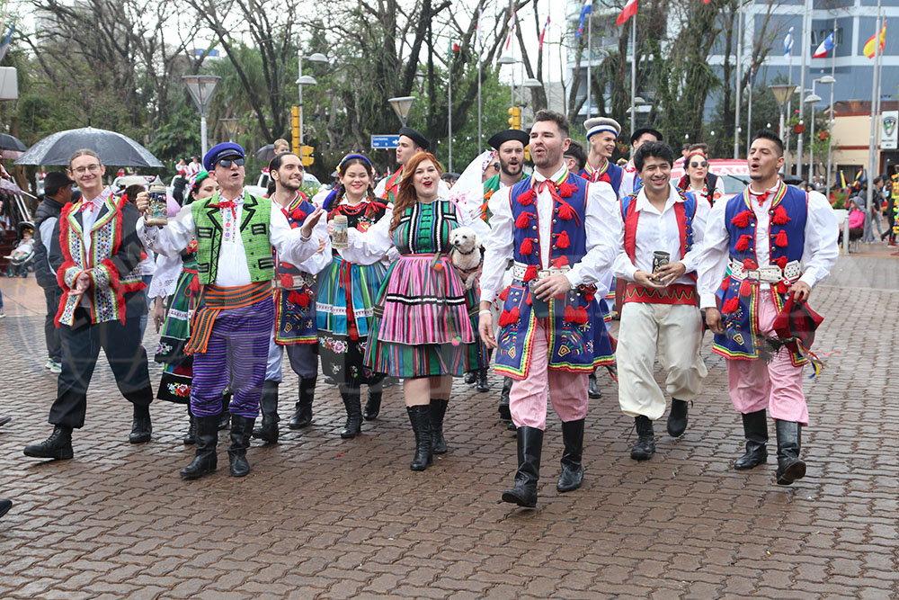 Con un gran marco de público, a pesar de la lluvia que comenzó a caer recién comenzado el desfile, las colectividades cumplieron con el recorrido habitual desde el Centro Cívico hasta la sede oficial de la Fiesta.