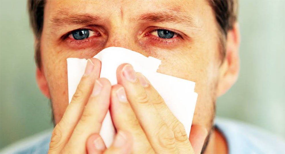 Sus síntomas, son variados, pueden ser secreciones nasales cristalinas y acuosas, nariz tapada, estornudos, picazón nasal, de ojos y oídos, lagrimeo, tos, falta de aire en algunos individuos con evidente alteración de la calidad de vida de quienes la sufren y de su entorno.