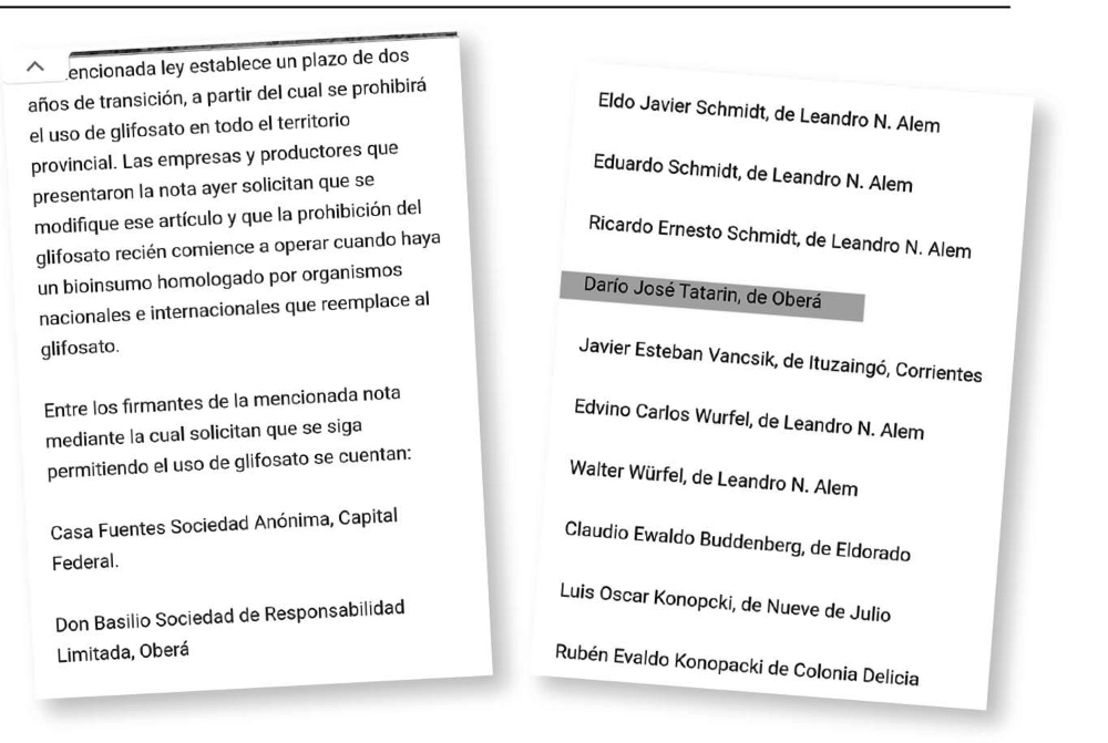 El pasado jueves, el técnico en Producción Agroindustrial del Instituto de Fomento Agropecuario e Industrial (IFAI), Darío Tatarín, elevó una nota al directorio de la institución y otra similar a la presidencia de la Legislatura provincial, donde informa que no ha participado, ni autorizado a usar sus datos personales a ningún tercero para que se incluya en una nota en la que se solicita que se siga permitiendo el uso de glifosato en las chacras posadeñas.