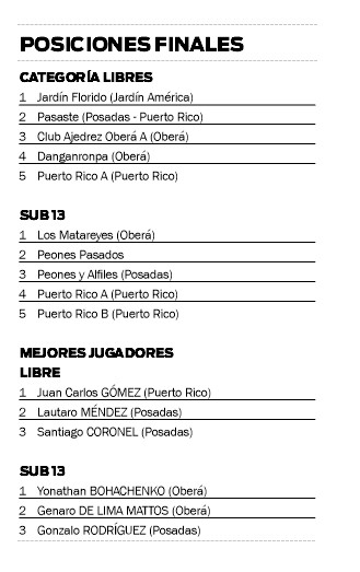 Con equipos de distintos puntos de la provincia, el último sábado se disputó la XXXIII edición del tradicional Torneo de Ajedrez por Equipos, que se realiza en el marco de la Fiesta Nacional del Inmigrante, en Oberá. Los ganadores fueron Jardín Florido, en Libres, y Los Matareyes en Sub 13.