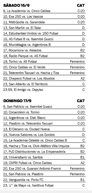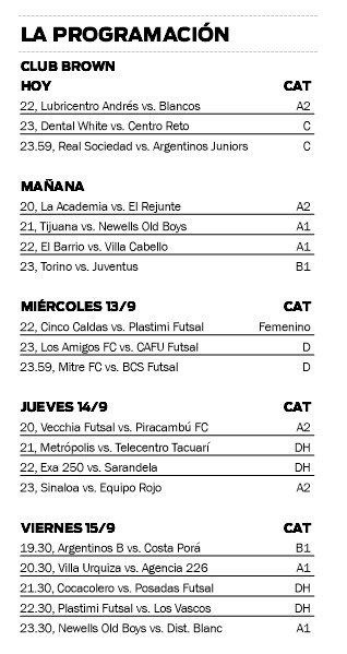 En cuanto a la jornada del miércoles, ese día en el Brown se abrirá una nueva fecha para las chicas, cuando desde las 22 choquen Cinco Caldas y Plastimi. Más tarde, a las 23 y por la D, Los Amigos FC enfrentarán al Club Atlético Fraterno Universitario (CAFU); mientras que desde las 23.59 se medirán por esa misma categoría Mitre FC y BCS Futsal.