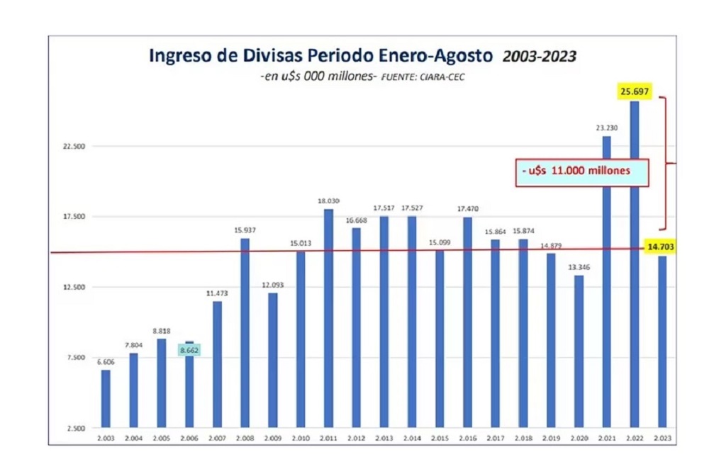 De acuerdo a la estadística de CIARA, en los primeros 8 meses del año el ingreso de divisas totalizó unos US$ 14.703 millones, lo que representa una caída de US$ 11.000 millones respecto a igual período de 2022, año en el que, vale destacar, se alcanzó una cifra récord de US$ 25.697 millones.