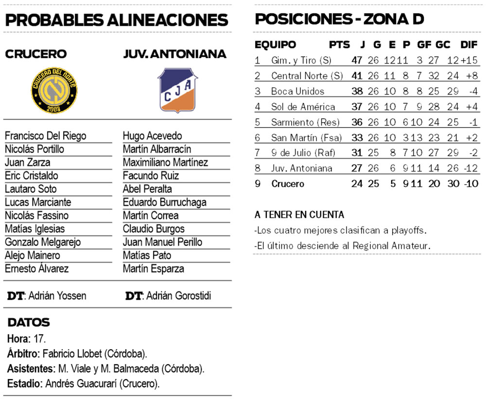 Claro que Juventud Antoniana tampoco está mejor. De hecho, el team salteño es el peor equipo de la zona en materia ofensiva, con apenas 14 goles a favor y 27 puntos, tres más que Crucero del Norte, que sigue último y ocupa así la única plaza de descenso al Regional Amateur.