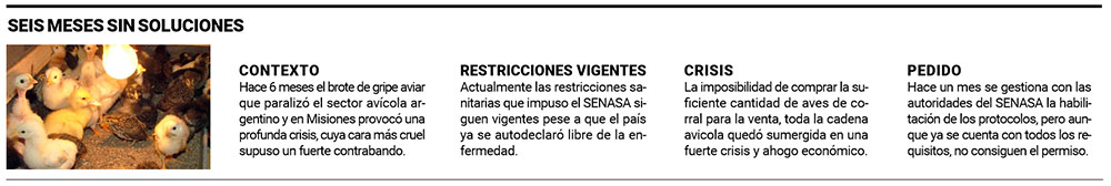 “El 4 de agosto pasado presentamos un pedido a las oficinas de SENASA en Posadas para que se autorice a las veterinarias y agropecuarias de la provincia a funcionar como puntos de entrega autogestivos de pollitos. Para eso, mi familia hizo una junta de firmas en toda la provincia para impulsar este petitorio y actualmente estamos trabajando en forma conjunta con las autoridades”, señaló Nadia Gibaja, una fuente del sector.