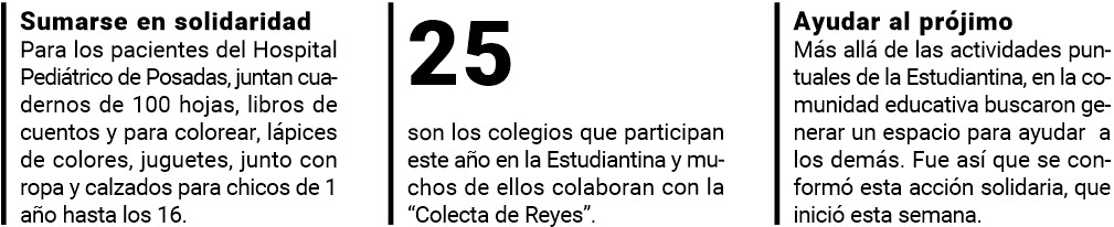 Más allá de la Estudiantina 2023, los estudiantes de los colegios posadeños se sumaron a una actividad con fines solidarios. En cada una de las instituciones educativas, comenzaron a recolectar útiles escolares, libros de cuentos y para colorear, además de ropa y calzado para donar al Hospital Pediátrico de Posadas.
