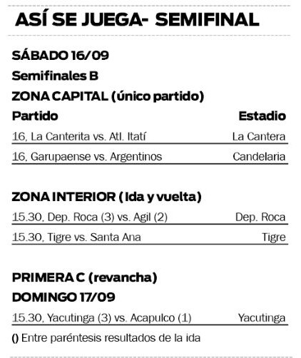 En el caso de las semifinales de la C, en la ida Atlético Yacutinga se impuso por 3-1 a Acapulco. La revancha se disputará el domingo en cancha de “Yacu”, desde las 15.30.