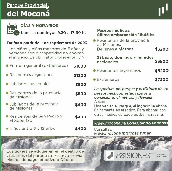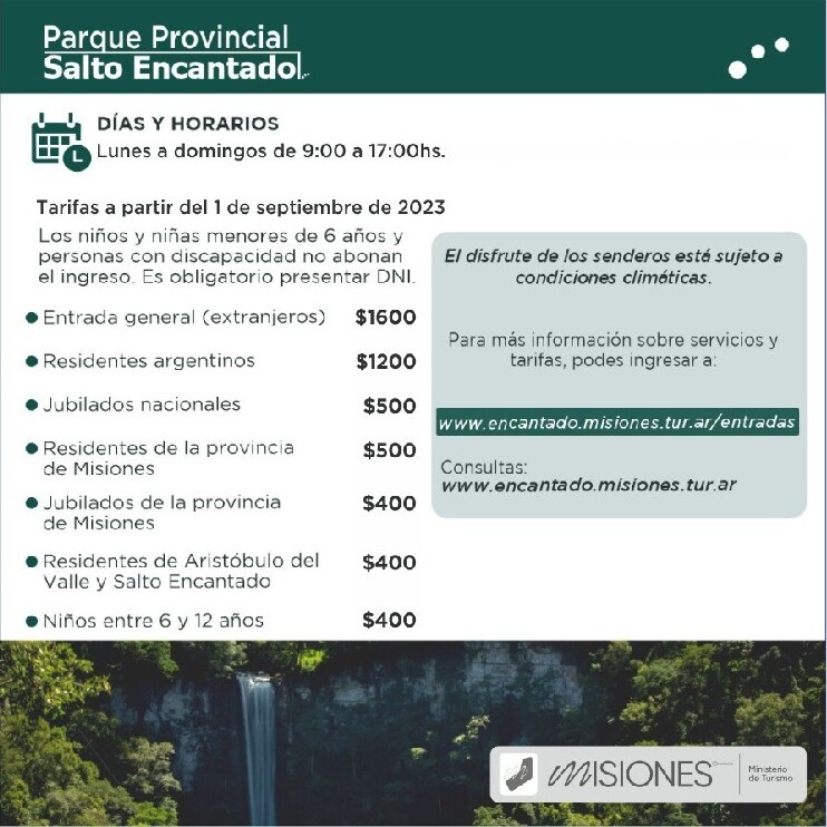 Desde el 1 de septiembre de 2023 entró en vigencia una actualización de las tarifas de ingreso a los parques provinciales de Misiones. Pero, a partir de este viernes 15 de septiembre se aplicarán los nuevos montos para ingresar al Parque Provincial del Moconá, Parque Temático de la Cruz y el Parque Provincial Salto Encantado.