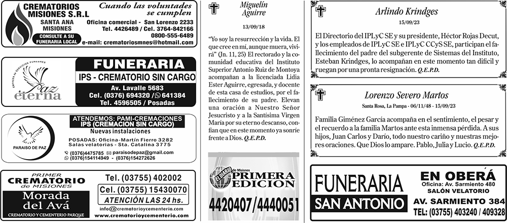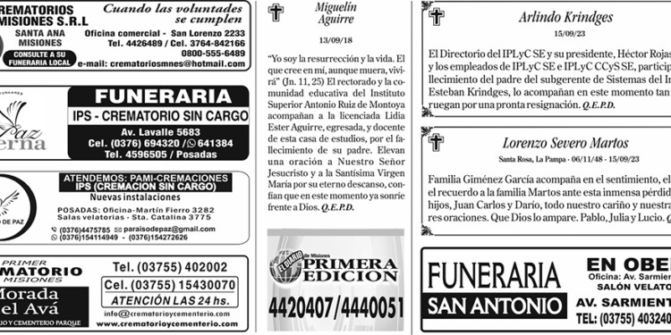 Fúnebres del domingo 17 de setiembre de 2023