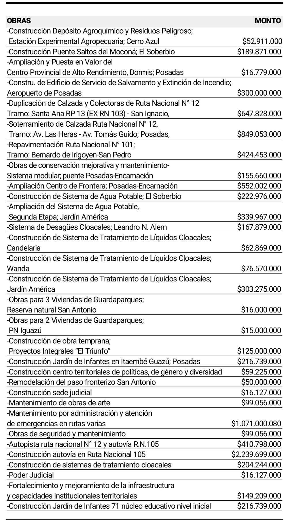Las obras que sí están representan una inversión $9.749 millones y, entre los puntos destacados, tiene la construcción de la autovía de la ruta nacional 105 en el tramo que va del By Pass de la ruta nacional 12 en Posadas con el empalme de la ruta nacional 14 en San José, por unos $2.239 millones.