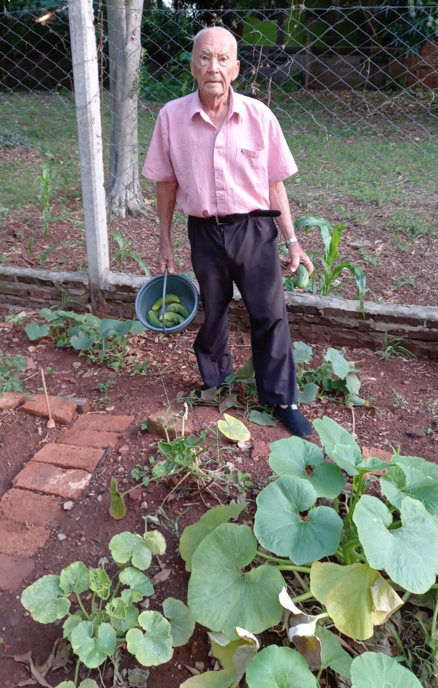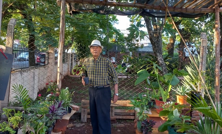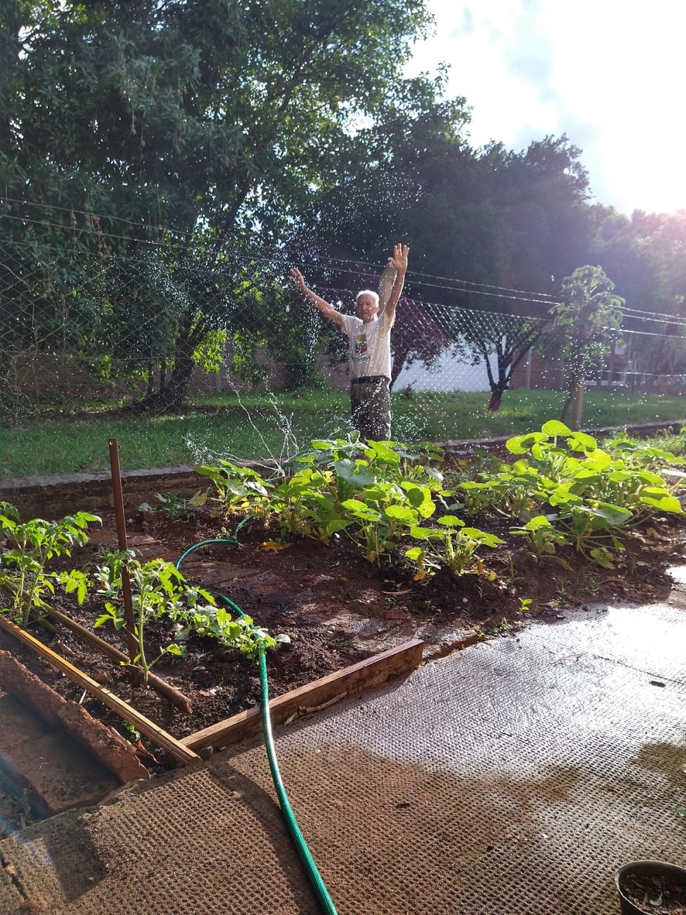 Dentro del Hogar, Don Benedicto reside desde 2021, cuando aún se transitaba la pandemia. “Ese fue uno de los motivos principales por el que Dios me dijo que tenía que salir de donde estaba. En ese momento vivía en Puerto Rico y al poco tiempo que llegué a Posadas supe que cinco personas cercanas, entre ellas un médico, un sacerdote y un amigo músico, fallecieron a causa del COVID-19”, lamentó. En este lugar, el huésped también es inquieto. Su hija contó que cuando ingresó, “yo pensaba en que tuviera cubiertas sus necesidades, que esté bien, que se alimente y que la gente de acá, que es muy amable, lo atienda. Pero él me dijo: no, yo quiero hacer cosas. No me quiero quedar solo para que me atiendan. Entonces empezó con el tema de las plantas de cuidar el jardín, limpiar el patio” ya que siempre fue un apasionado de las plantas, y producía verduras y frutas en cualquier espacio.