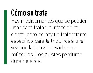 La triquinosis es una zoonosis que se puede transmitir de los animales a las personas. Estas se pueden enfermar al consumir carne insuficientemente cocida o productos elaborados con carne de cerdo o de animales silvestres -como jabalíes o pumas- que contienen en sus músculos larvas del parásito.