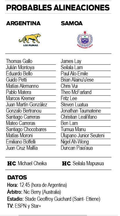 El seleccionado argentino de rugby, Los Pumas, se enfrentará hoy con Samoa en busca de su primer triunfo en el Mundial Francia 2023, luego de un fallido debut, con la intención de conservar las chances de acceder a cuartos de final.