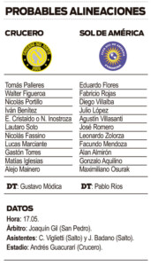 Para este duelo, Crucero no podrá contar con el arquero Francisco Del Riego, expulsado; pero volverá de la fecha de suspensión el defensor Eric Cristaldo. “Pinti” Álvarez sigue lesionado.