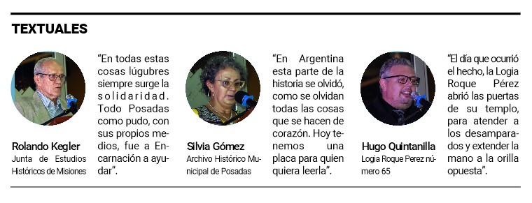 Silvia Gómez, miembro del Archivo Histórico Municipal, fue la encargada de dar un emotivo discurso donde explicó cómo la sociedad posadeña en cuestión de minutos se organizó para ayudar a la devastada Encarnación. “Hay un gran agradecimiento de parte de los encarnacenos y me atrevo a decir, vergüenza de este lado, porque como todas las cosas que se hacen de corazón, la historia no las cuenta”.