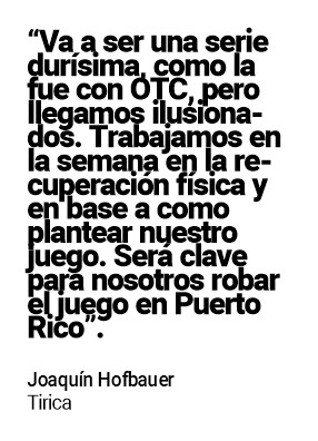 Tirica, por su lado, viene haciendo historia con un plantel realmente corto, ya que en el inicio de los playoff perdió a Gonzalo Rojas y Emanuel Duarte por lesión y hoy cuenta con tan solo cuatro fichas mayores. El inmejorable momento de Joaquín Hofbauer y el acompañamiento de Juan Pablo Rojas, Facundo Aguirre y Andrés Paredes, más los juveniles, los mantiene en pie de guerra.