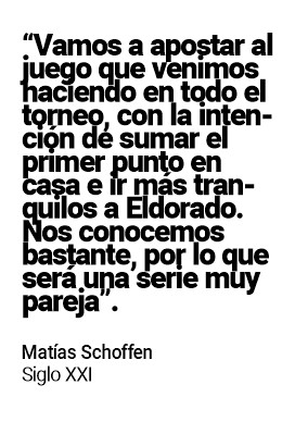 Siglo, que finalizó segundo en la clasificación general de la fase regular, apuesta fuerte a sus dos grandes cartas de gol, que son Luciano Venialgo y Matías Schoffen, además de la férrea defensa que lo caracteriza. Además, para el entrenador es clave tomar el mayor porcentaje de rebotes y lastimar con la segunda bola.