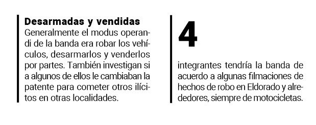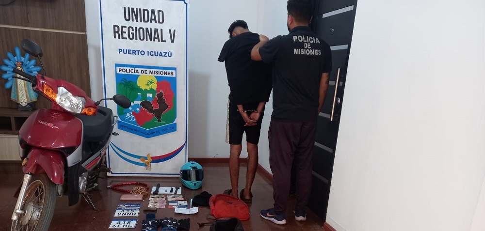El sospechoso tiene 20 años y al momento de la aprehensión circulaba en una motocicleta 110 roja sin patente que luego se determinó que fue la robada días atrás en Nueve de Julio, jurisdicción de la Unidad Regional III de Eldorado.