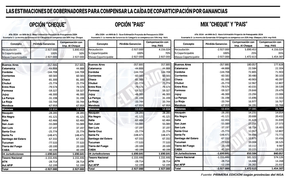 PRIMERA EDICIÓN pudo acceder en exclusiva a las propuestas, donde se estima que Misiones podría dejar de percibir más de 53.000 millones de pesos en 2024 por la merma de giro de recursos del impuesto a las Ganancias. Las opciones que quedaron ahora en manos de Economía nacional son: