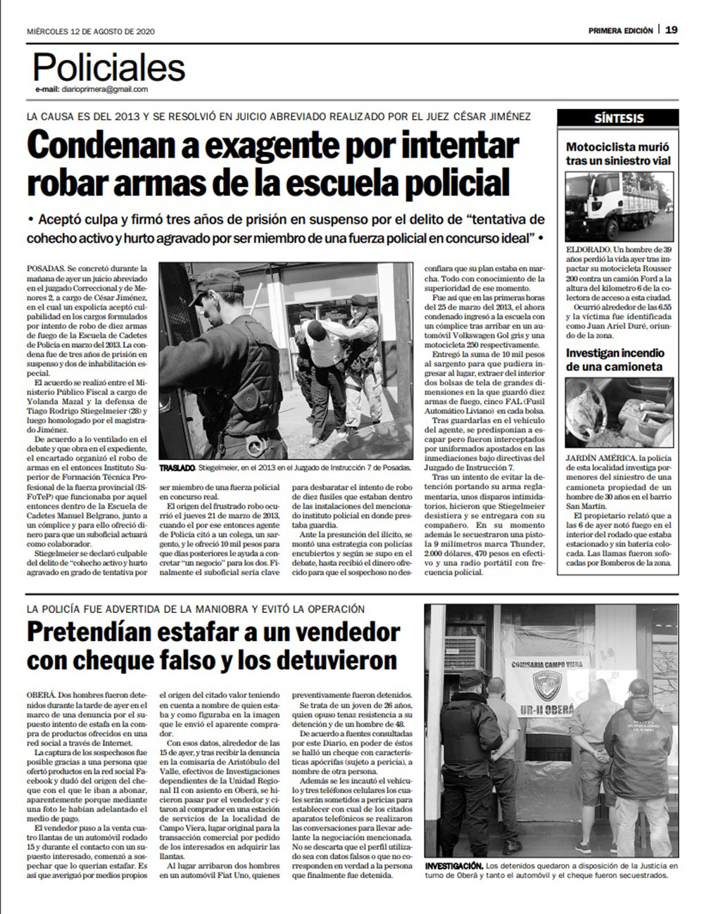 Vale recordar que Stiegelmeier fue condenado en 2020 a tres años de prisión en suspenso, tras un acuerdo de juicio abreviado por un hecho de robo y coima denunciado por directivos del Instituto Superior de Formación Técnica Profesional de la fuerza provincial (ISFOTEP) que funcionaba en ese entonces en la Escuela de Cadetes Manuel Belgrano en el barrio Miguel Lanús de Posadas.