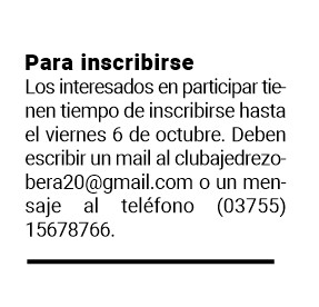 El costo de inscripción por cada jugador será de 700 pesos y habrá tiempo de anotarse hasta el viernes 6 de octubre a las 18. Los interesados pueden escribir un mail al [email protected] o un mensaje al teléfono (03755) 15678766.