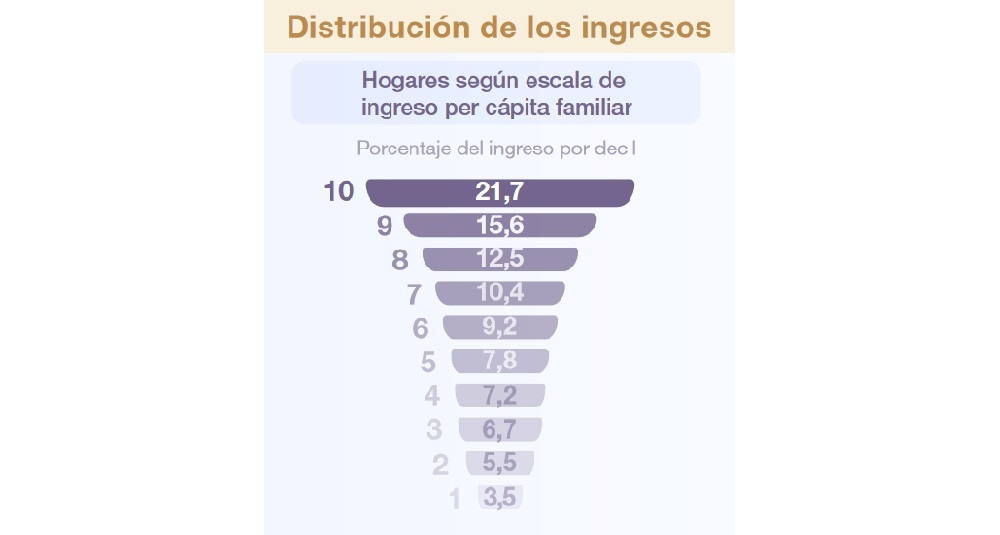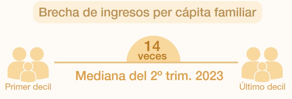 En el decil más rico de la población la mediana del ingreso per cápita fue de $230.000 en tanto que en el decil más pobre alcanzó los $17.000, de allí que la brecha de ingresos entre ambos extremos de la población sea de 14 (similar a la registrada en igual período de 2022).