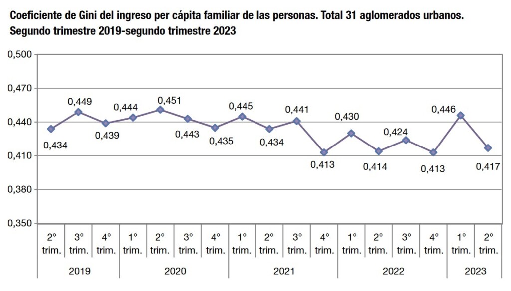 Su valor fue de 0,417, siendo cero el valor que implica igualdad absoluta y uno desigualdad total, mientras que en igual período del año pasado había sido de 0,414. Se mantiene igual dentro de los mejores registros para un segundo trimestre en los últimos años y deja atrás los valores del primer trimestre que habían sido poco favorables.