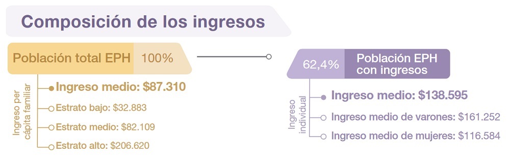 El ingreso promedio per cápita del total de la población alcanzó los 87.310 pesos, mientras que la mediana del ingreso per cápita fue de 65.500 pesos: es decir la mitad de la población encuestada cobra hasta esa suma de dinero.