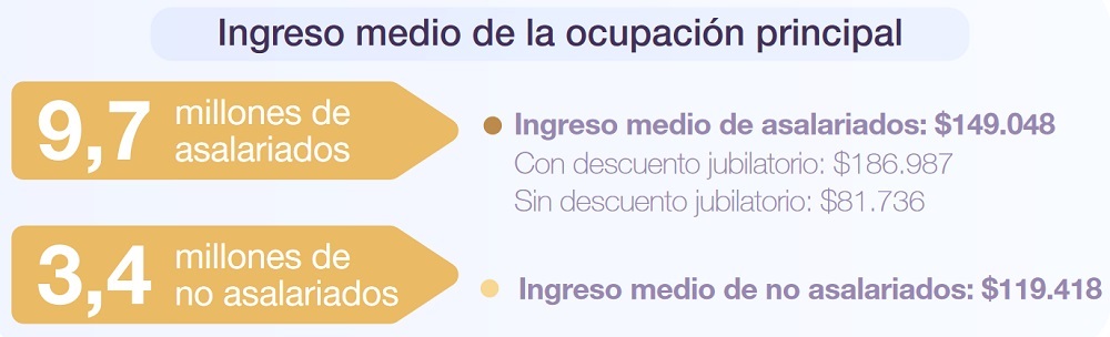 Si se tomaran en cuenta, solamente, los ingresos relacionados al trabajo, la máxima autoridad estadística refleja que el ingreso medio de los 9,7 millones de asalariados fue de $149.048 mientras que, en su conjunto, los 3,4 millones de no asalariados, percibieron, en promedio, $119.418.