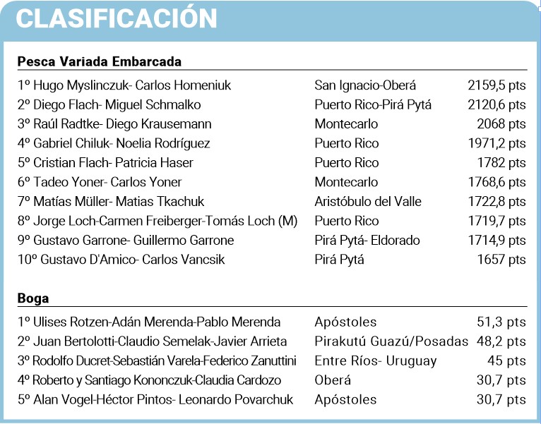 El primer puesto en este campeonato fue para Ulises Rotzen, Adán Merenda y Pablo Merenda, quienes fiscalizaron cinco bogas que totalizaron 263 centímetros, entre ellas un ejemplar de 71 centímetros.