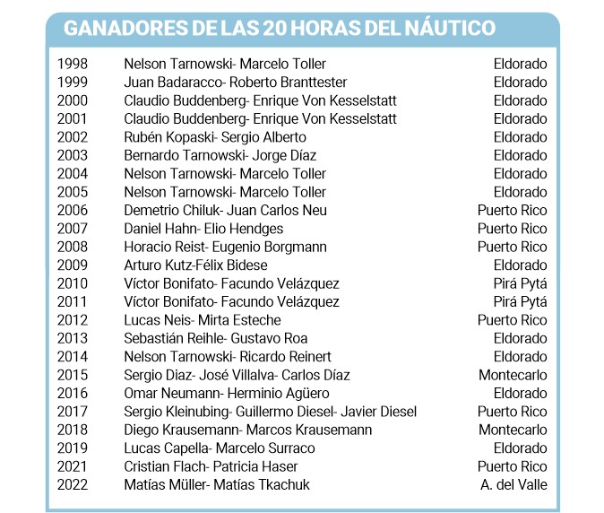 El cierre del calendario de competencias de la Federación Misionera de Pesca y Lanzamiento de Misiones (FeMiPyL) se realizara el 28 y 29 de octubre en el Club Náutico Eldorado con las ya tradicionales 20 Horas de Pesca Variada Embarcada. Será la Edición 25 de una maratón que tiene al local Nelson Tarnowski como el más ganador de la historia.