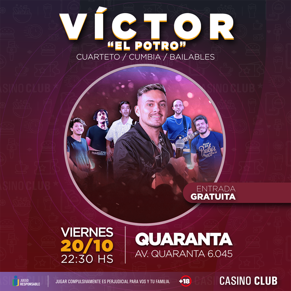 ¡¡¡Presenta su banda en vivo!!! Víctor, es de Posadas, canta cuarteto desde el 2017 que fue a Córdoba hacer el casting para la Película de Rodrigo. Motivado por la música del potro cordobés eligió ese estilo para desplegar su arte, siempre dando lo mejor. En cada una de sus presentaciones transmite mucha energía y alegría cantando a Rodrigo y agregando a su repertorio algunas obras de otros artistas del cuarteto y de la movida tropical, muy conocidos por todos.